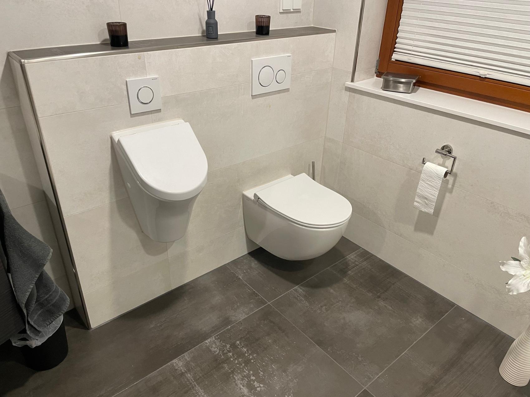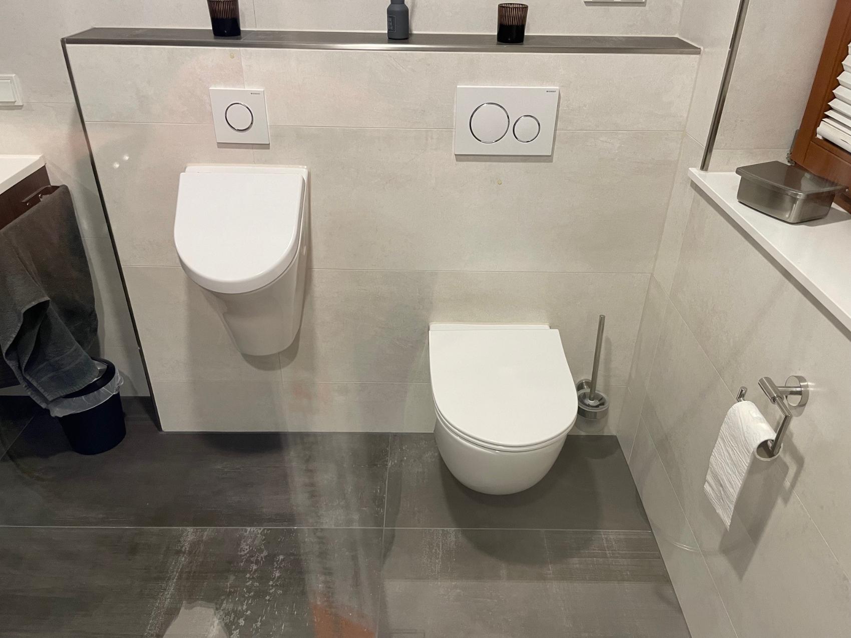 Ergänzt wird die Ausstattung durch ein wandhängendes WC und ein zusätzliches Urinal, das den Komfort und die Alltagstauglichkeit des Badezimmers deutlich erhöht. Auch die sorgfältige Auswahl der Produkte spielte eine wichtige Rolle: Hochwertige Marken wie Grohe, Geberit und HSK gewährleisten langlebige Qualität, modernes Design und zuverlässige Funktionalität – für ein Bad, das sowohl optisch als auch technisch überzeugt.