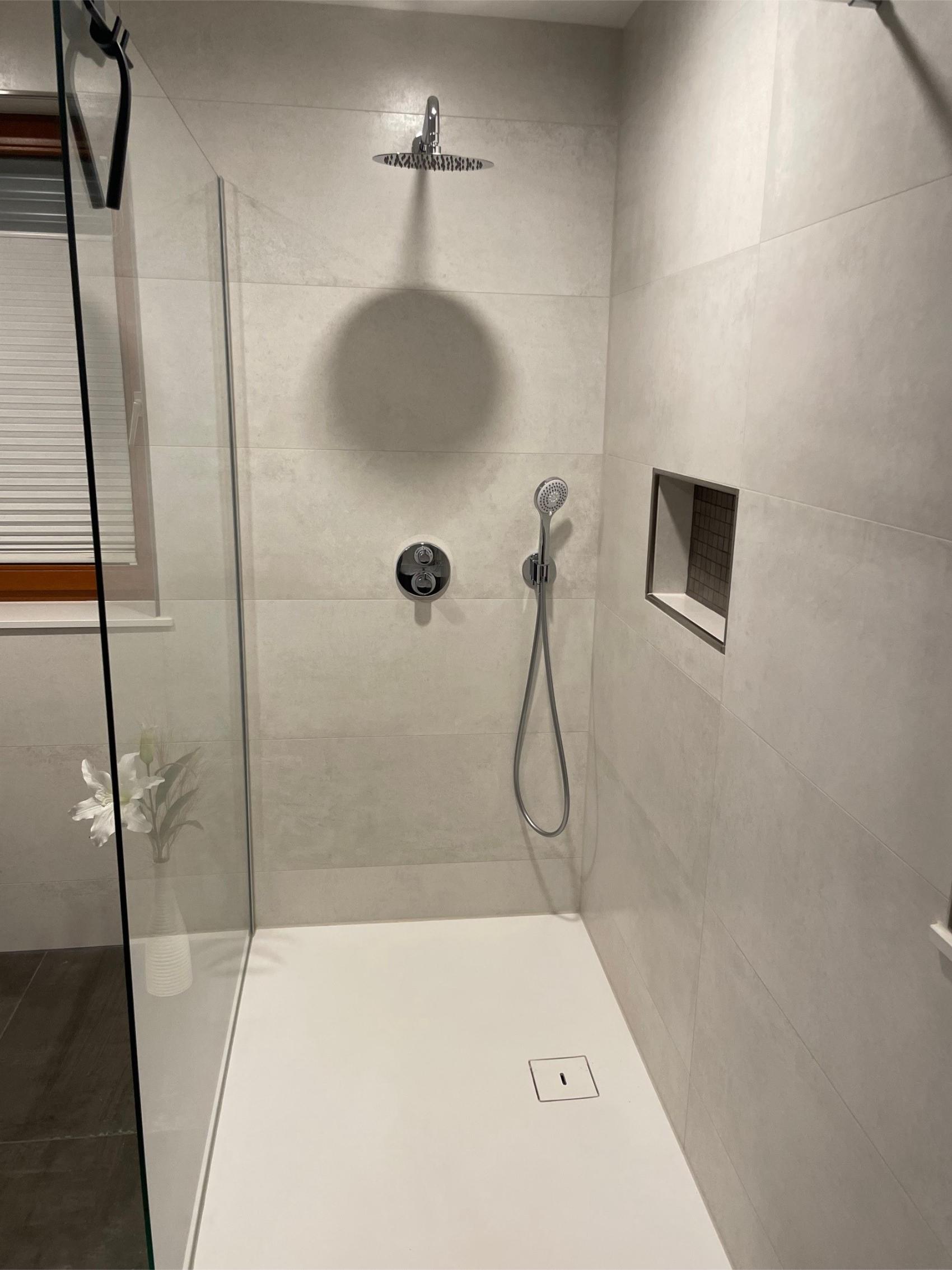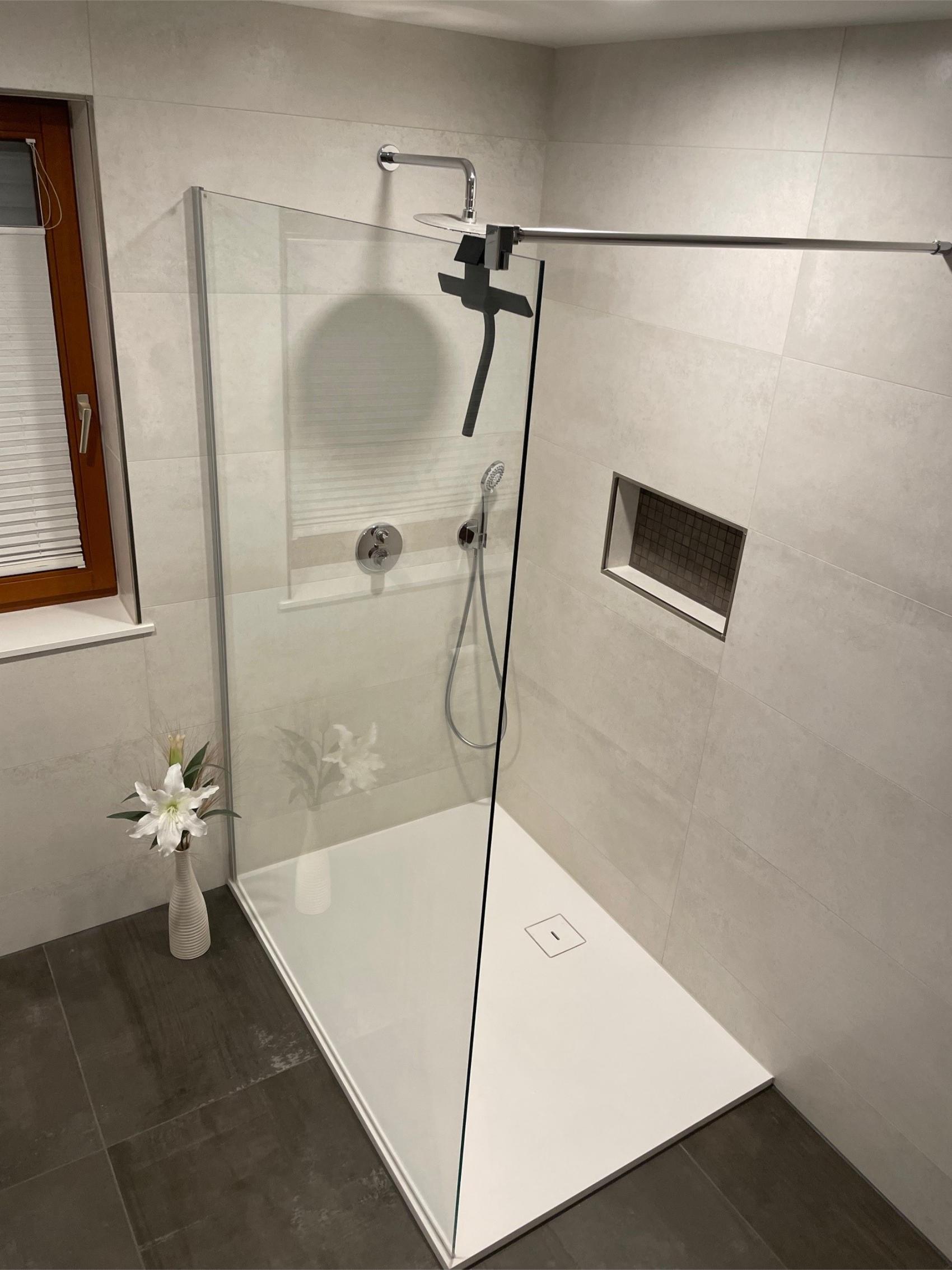 In Bad Hersfeld wurde ein Altbau-Badezimmer vollständig modernisiert und funktional aufgewertet. Die neue Dusche mit eleganter Duschwanne und gläserner Trennwand fügt sich harmonisch in das Raumkonzept ein. Eine integrierte Wandnische bietet praktischen Stauraum für Pflegeprodukte und sorgt zugleich für eine aufgeräumte Optik. Der gesamte Duschbereich überzeugt durch klare Linien, hochwertige Materialien und eine pflegeleichte Oberfläche.